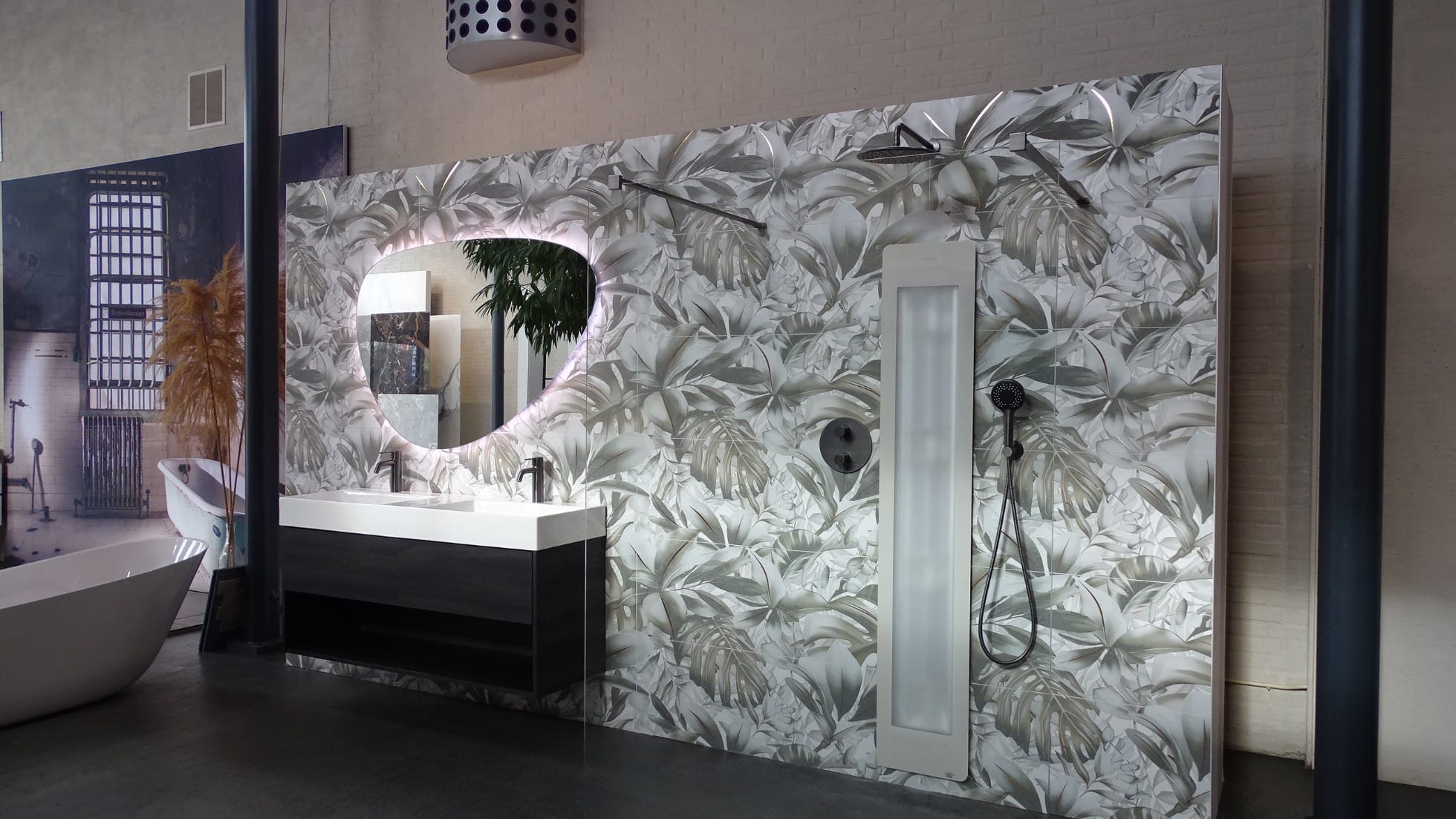 Een badkamer waar je niet omheen kunt. De tropische print op de wand vormt een uniek decor voor het stijlvolle badmeubel en de luxueuze douche. De speelse spiegel en indirecte verlichting versterken de bijzondere sfeer, terwijl de functionaliteit behouden blijft.