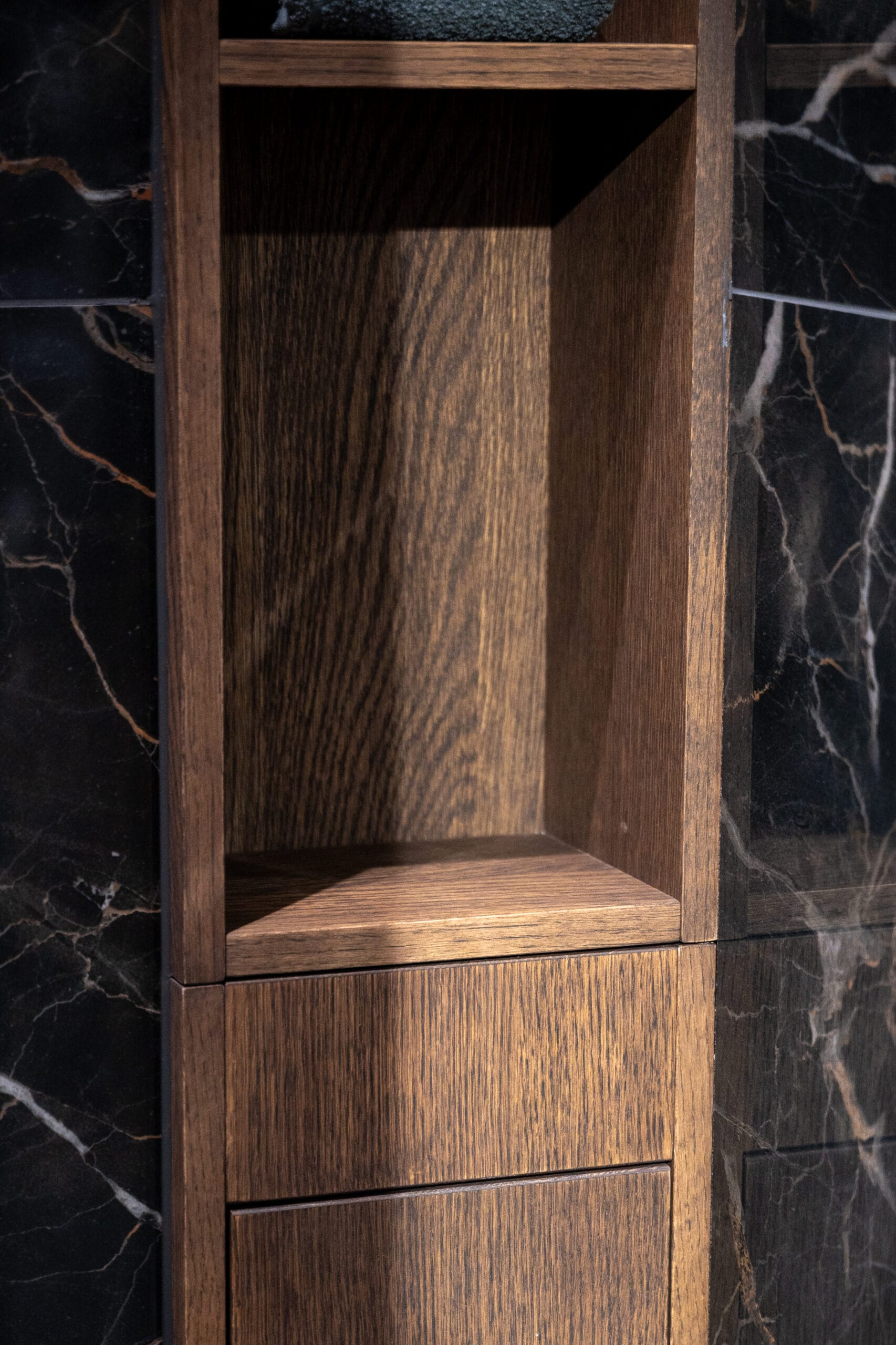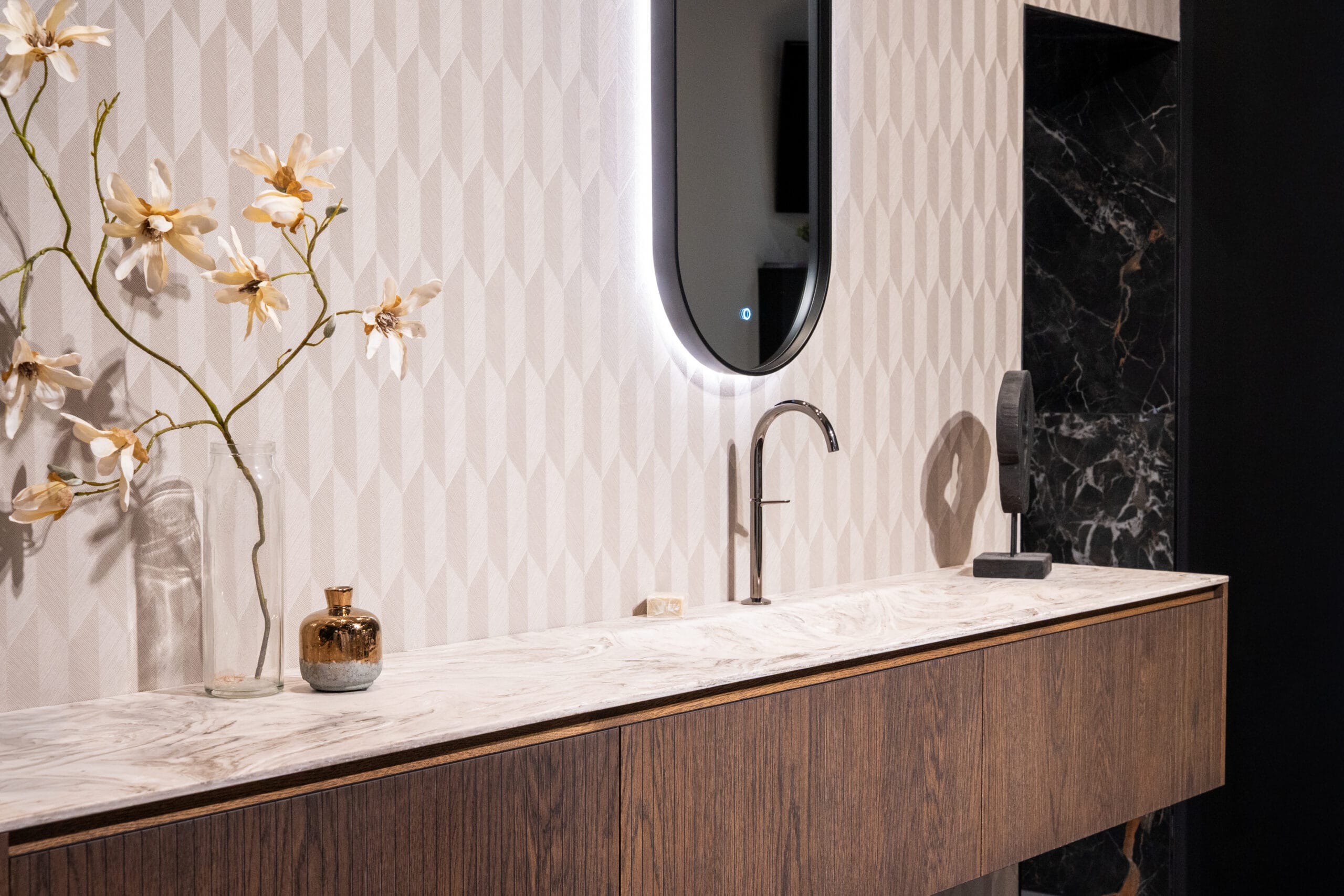 Deze badkamer ademt klasse door de combinatie van warme houttonen, elegante patronen en subtiel geïntegreerde verlichting. De vormen van het meubel worden versterkt door het zachte lijnenspel in de wandafwerking en de glans van de armaturen. Een ruimte waarin rust, verfijning en luxe samensmelten.