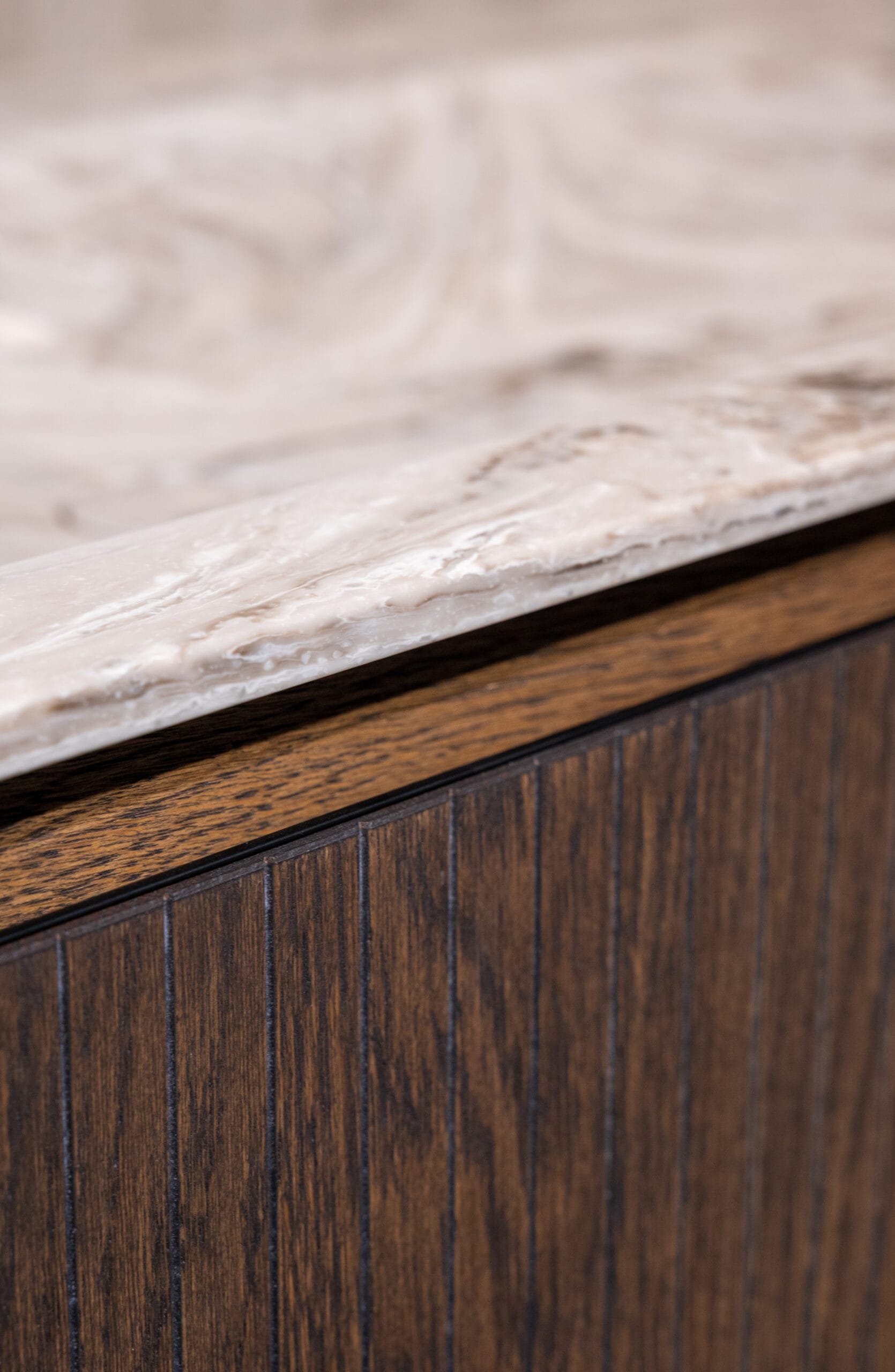 Het wastafelblad is uitgevoerd in één doorlopend stuk, waarin de waskom naadloos is geïntegreerd. Dit zorgt niet alleen voor een strak esthetisch beeld, maar ook voor optimaal onderhoudsgemak. Een subtiel statement van vakmanschap en design.