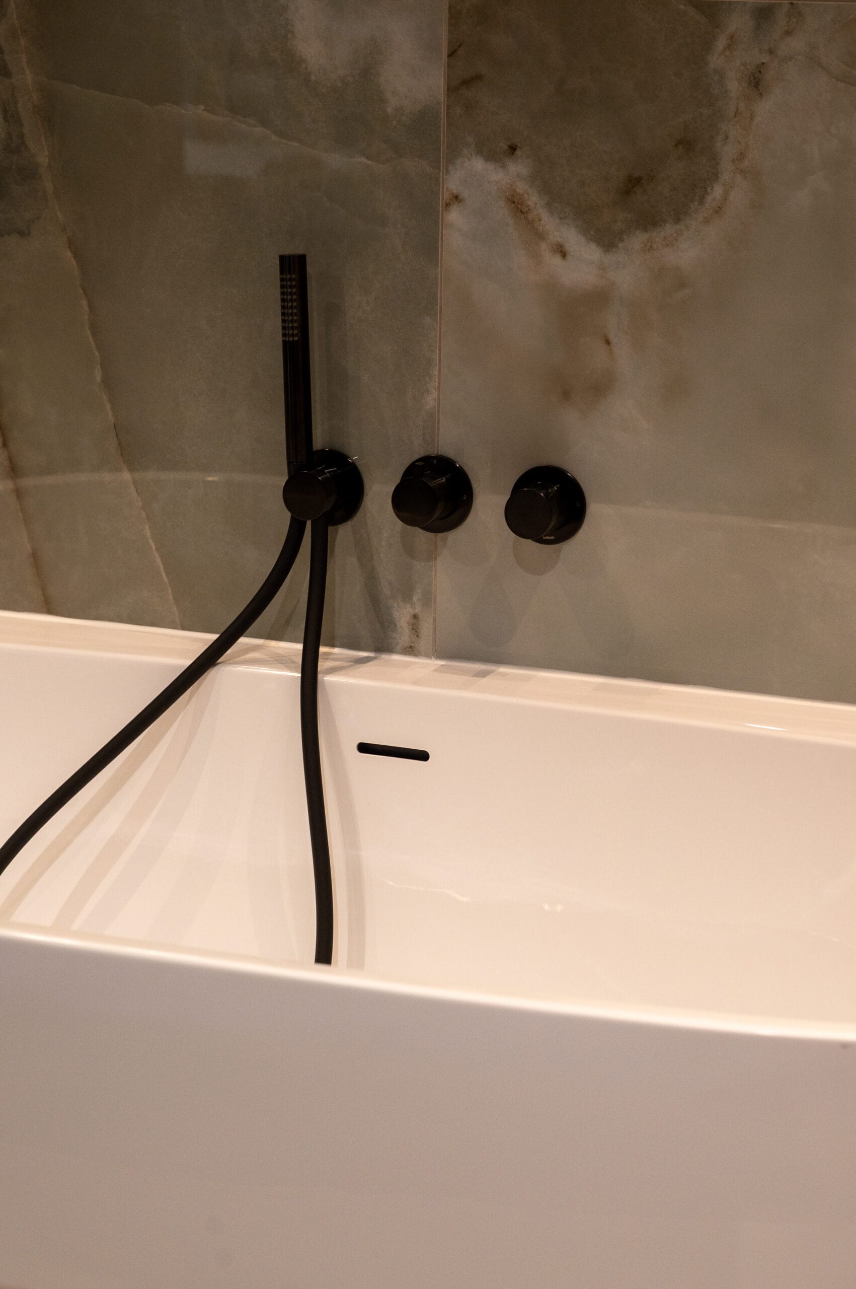 De zwarte elementen, van de kraan tot de designradiator en de waskom, zorgen voor een krachtig contrast met het lichte sanitair en de natuurlijke materialen. Deze subtiele accenten geven de badkamer een moderne en eigentijdse uitstraling.