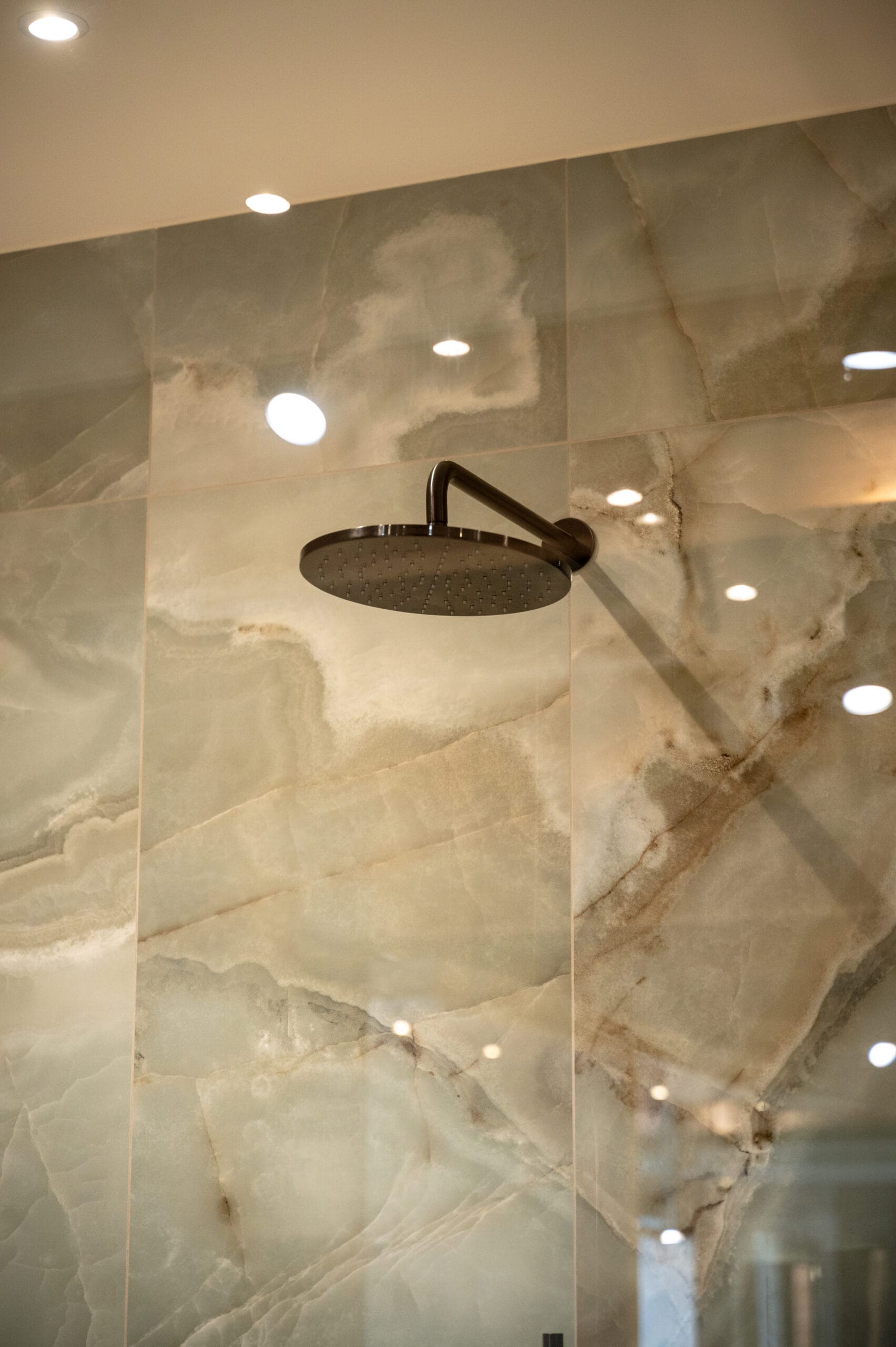 Deze badkamer ademt wellness. De vrijwel vrijstaande badkuip, warme houtaccenten en grote marmerlook tegels geven het geheel een luxueuze uitstraling. De open indeling en zachte kleuren zorgen voor een ontspannen sfeer waarin je echt tot rust komt.