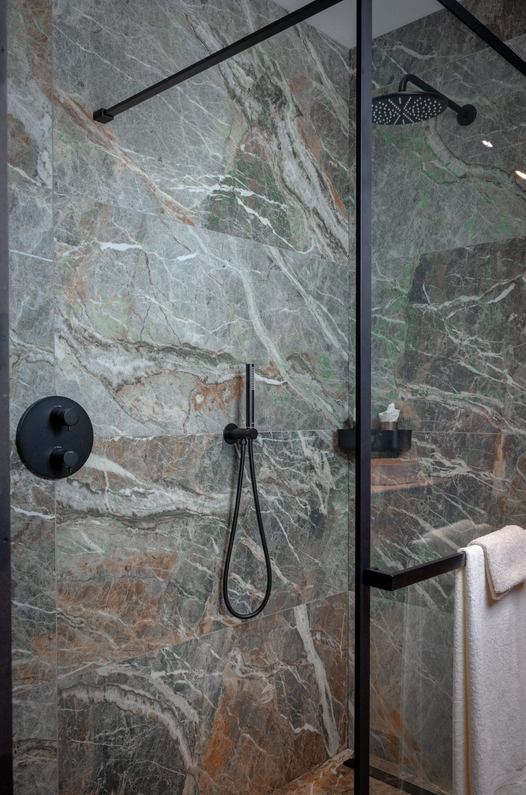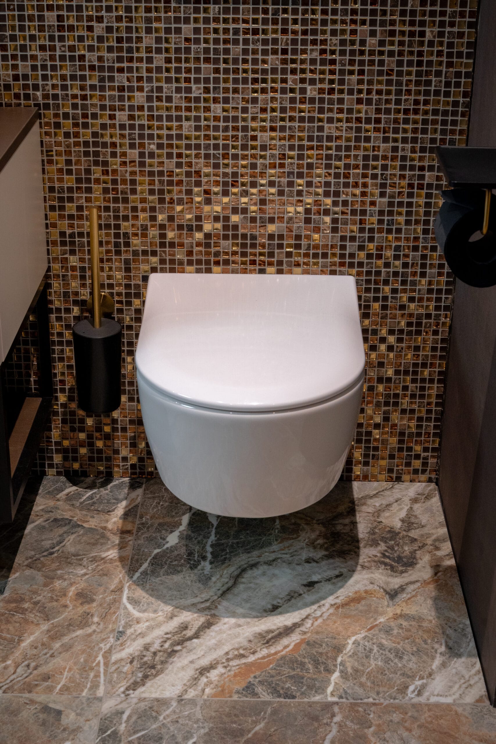 Deze badkamer ademt elegantie. De combinatie van donkere wanden, een natuurstenen vloer en het grote ronde spiegelpaneel zorgt voor een warme, luxe hotelsfeer. De symmetrische indeling en hoogwaardige afwerking geven het geheel een serene uitstraling. Een plek waar comfort en klasse moeiteloos samenkomen.