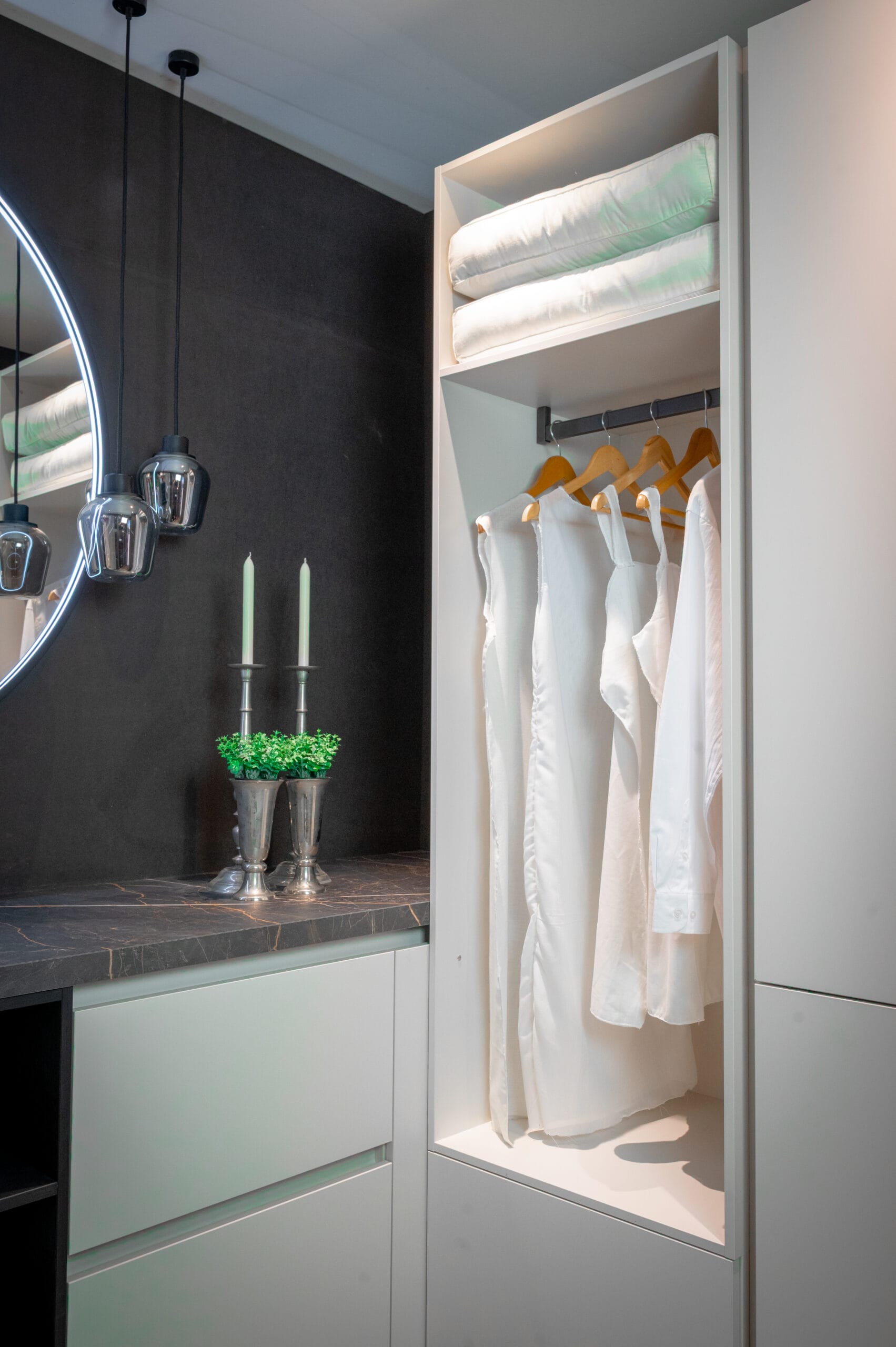 Dankzij de ruime lades en open nissen biedt deze badkamer verrassend veel opbergruimte. Alles wat je dagelijks nodig hebt (en meer!), is overzichtelijk en binnen handbereik opgeborgen. En dat zonder in te leveren op design.