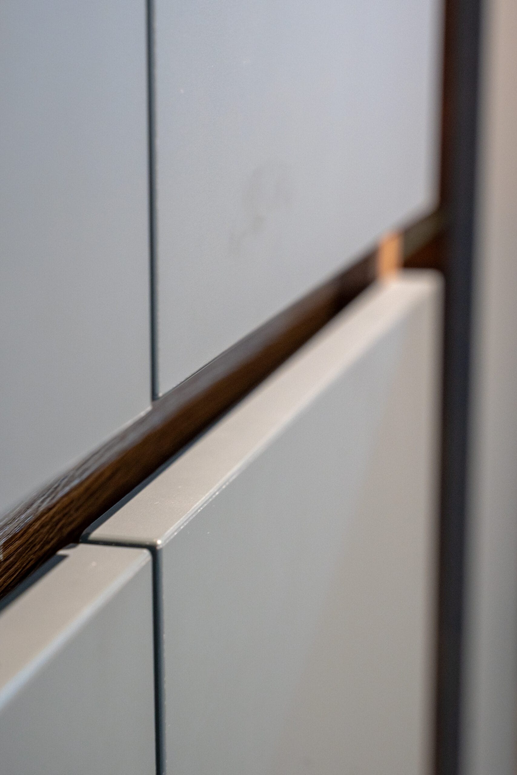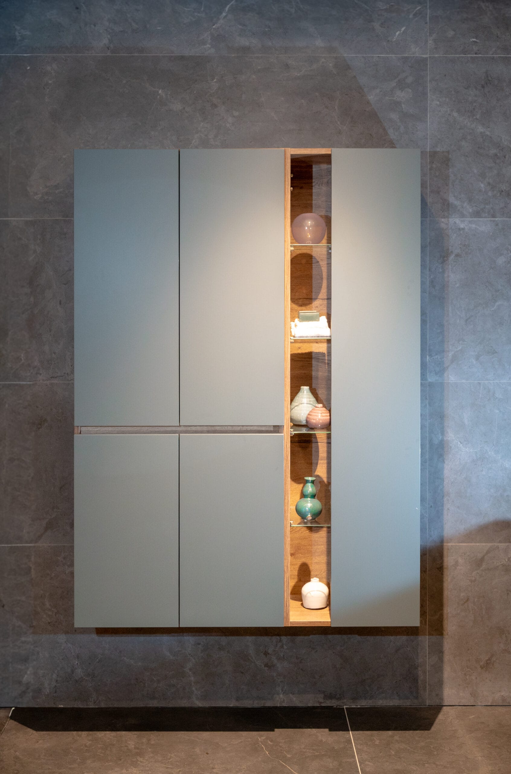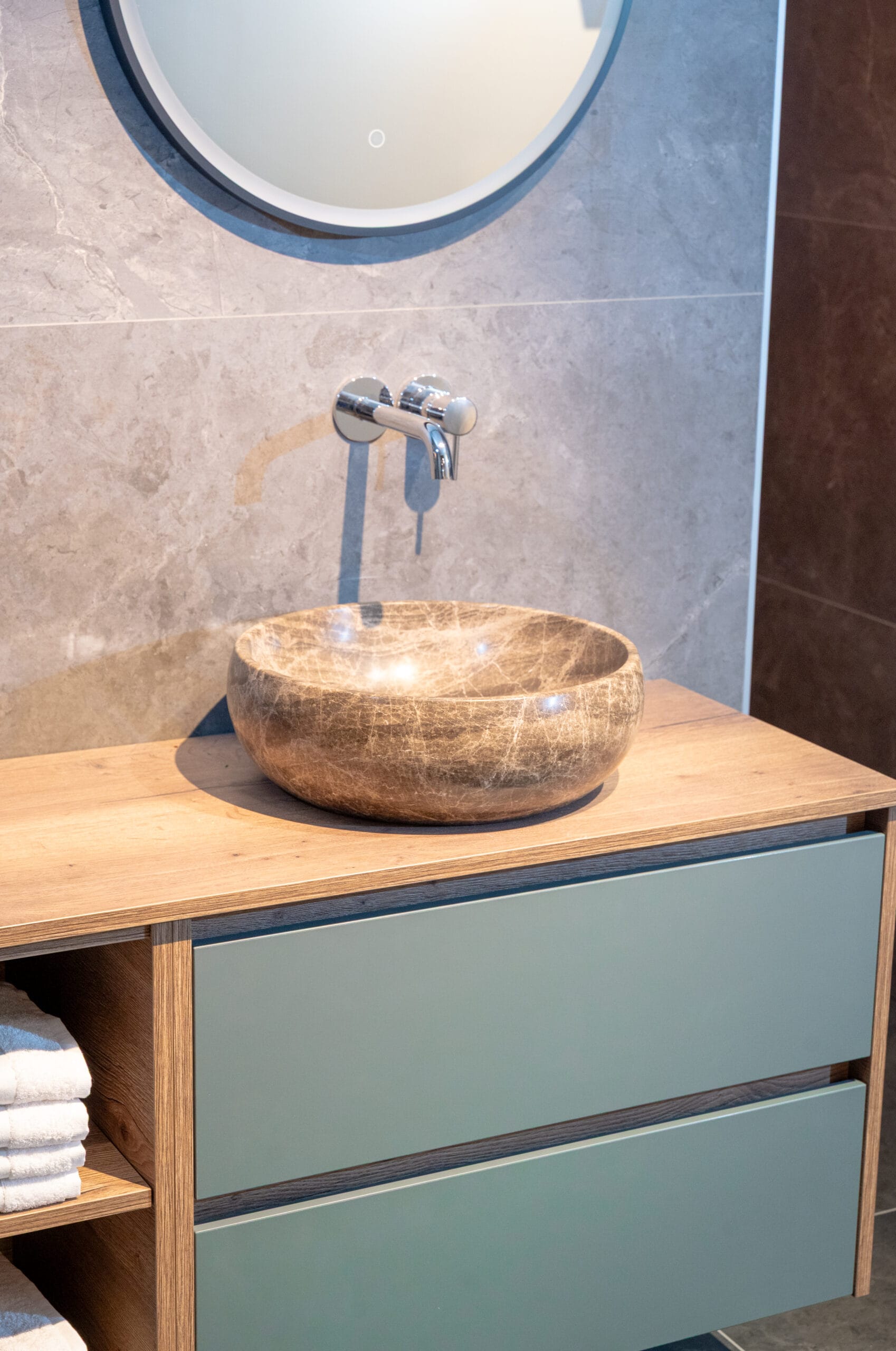 Een badkamer waarin natuurlijke materialen en moderne vormen elkaar ontmoeten. Het warme hout, de rustige grijstinten en de sfeervolle belichting creëren samen een kalme, bijna spa-achtige sfeer. De nis met open vakken biedt praktische opbergruimte, terwijl de stijlvolle spiegel met leren band de ruimte een eigentijds karakter geeft. Hier begint en eindigt de dag in balans.