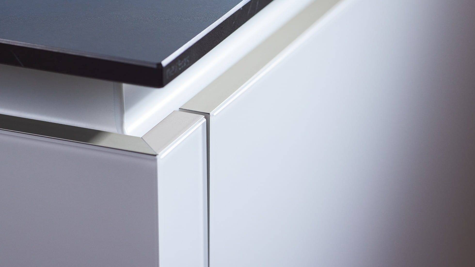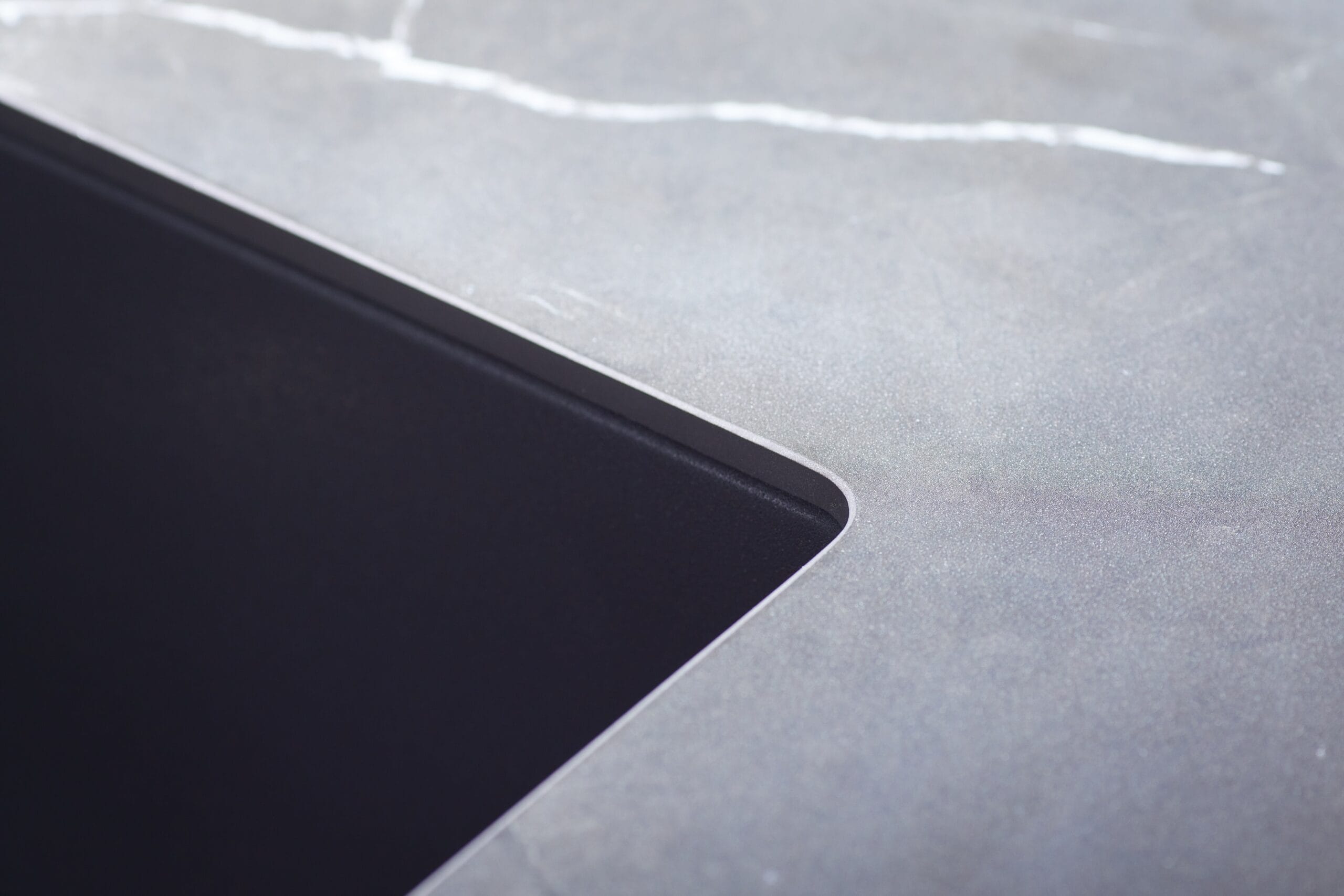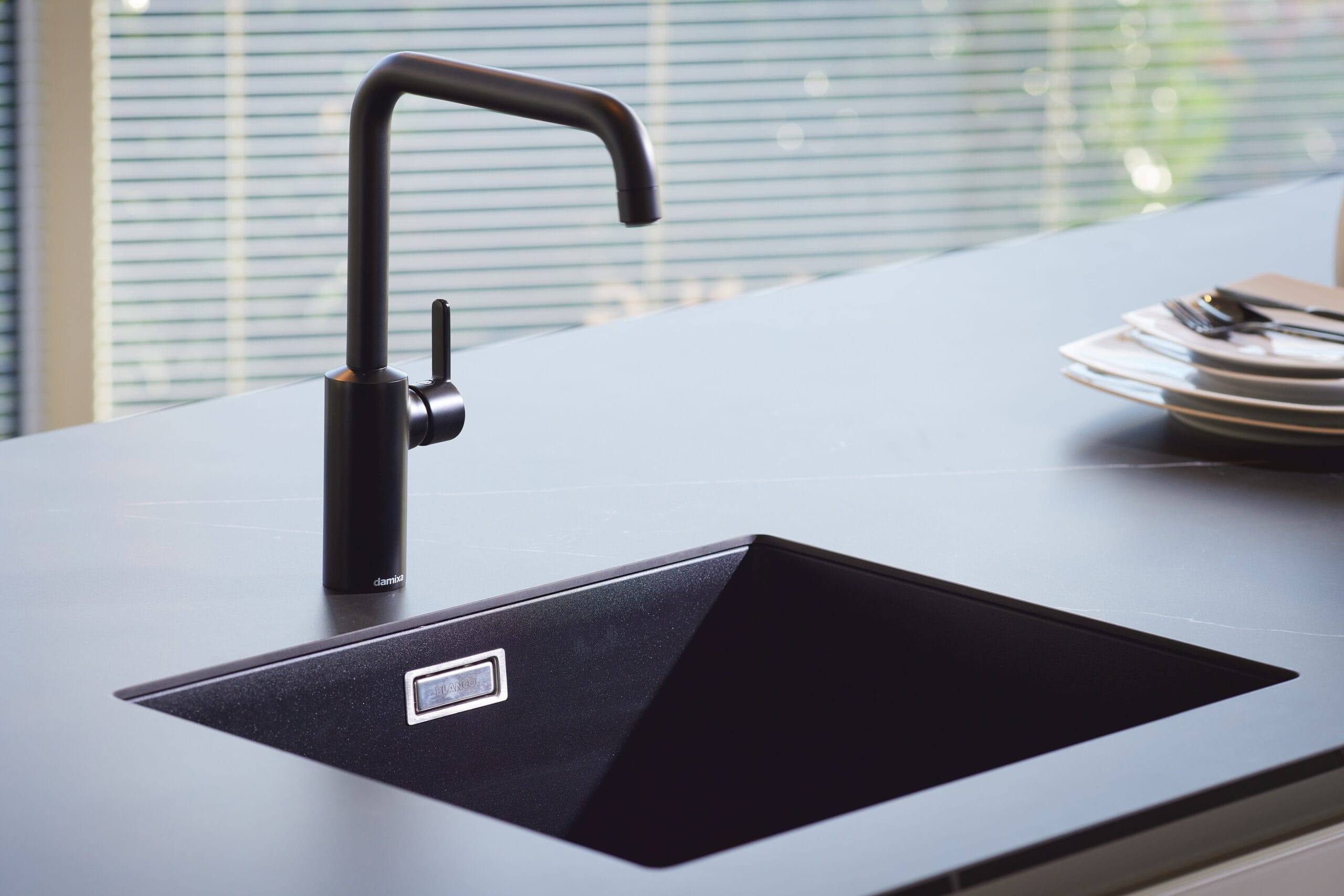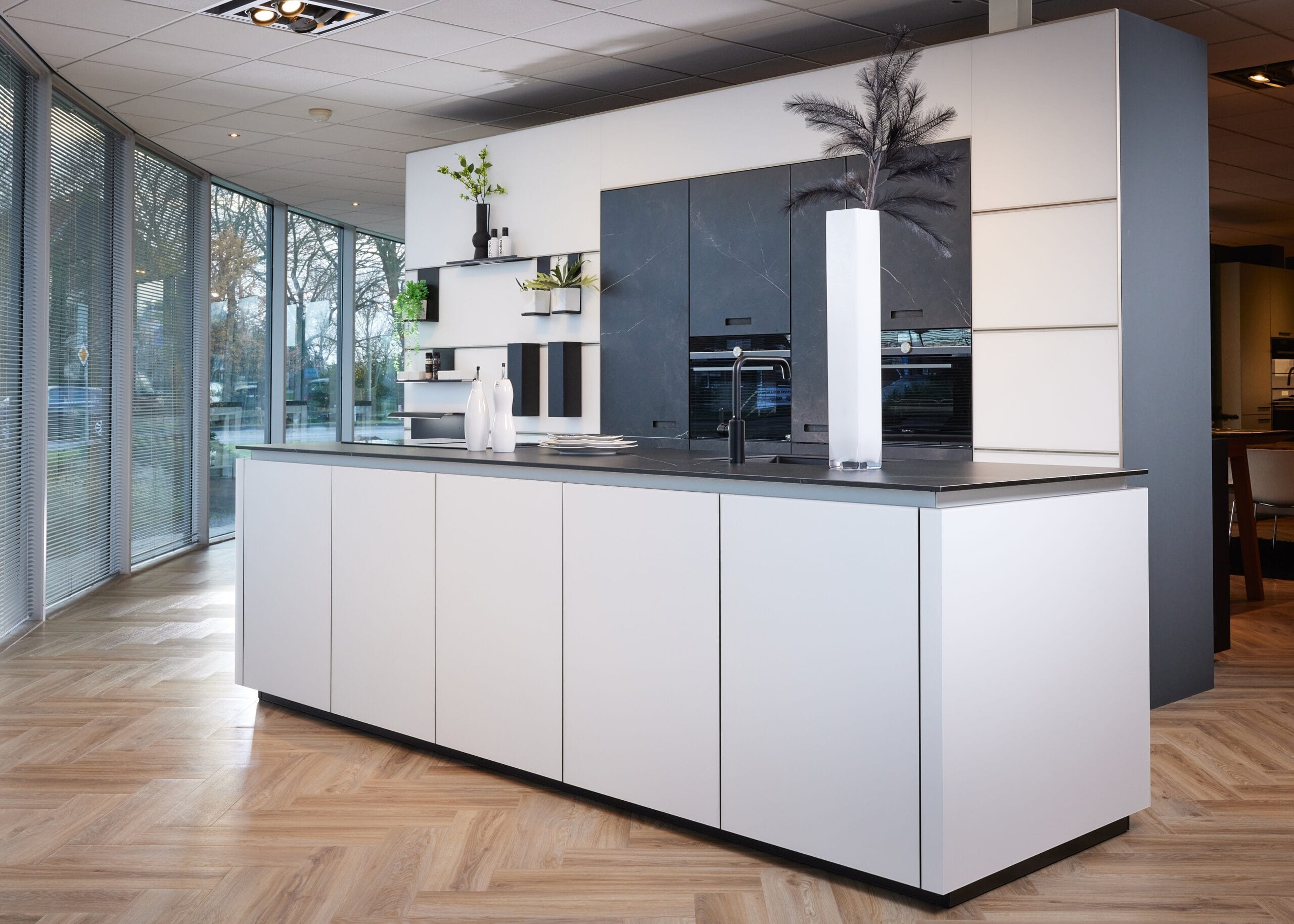 Deze luxueuze eilandkeuken combineert strak design met hoogwaardige materialen. De fronten in mat kristalwit glas zorgen voor een serene basis, terwijl het keramiek in marmer nero-look de achterwand en nis een verfijnde, elegante uitstraling geven. Het eiland fungeert als blikvanger, zonder te overheersen. Door de rustige kleurstelling oogt de ruimte groter dan ze is. De lavazwarte plint laat het eiland subtiel zweven en versterkt het ruimtelijke effect. Het dunne, robuuste werkblad van Systemo (slechts 1,5 cm dik) sluit naadloos aan bij het minimalistische karakter en is bovendien uiterst hygiënisch en onderhoudsvriendelijk. Een keuken die luxe, comfort en rust moeiteloos samenbrengt.