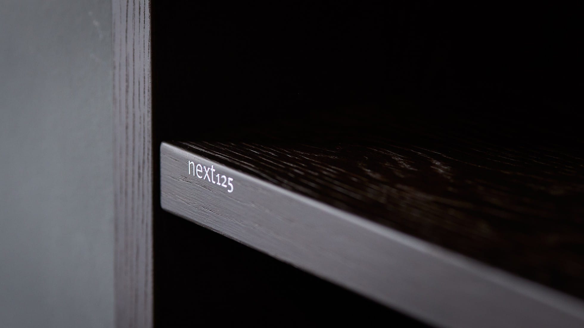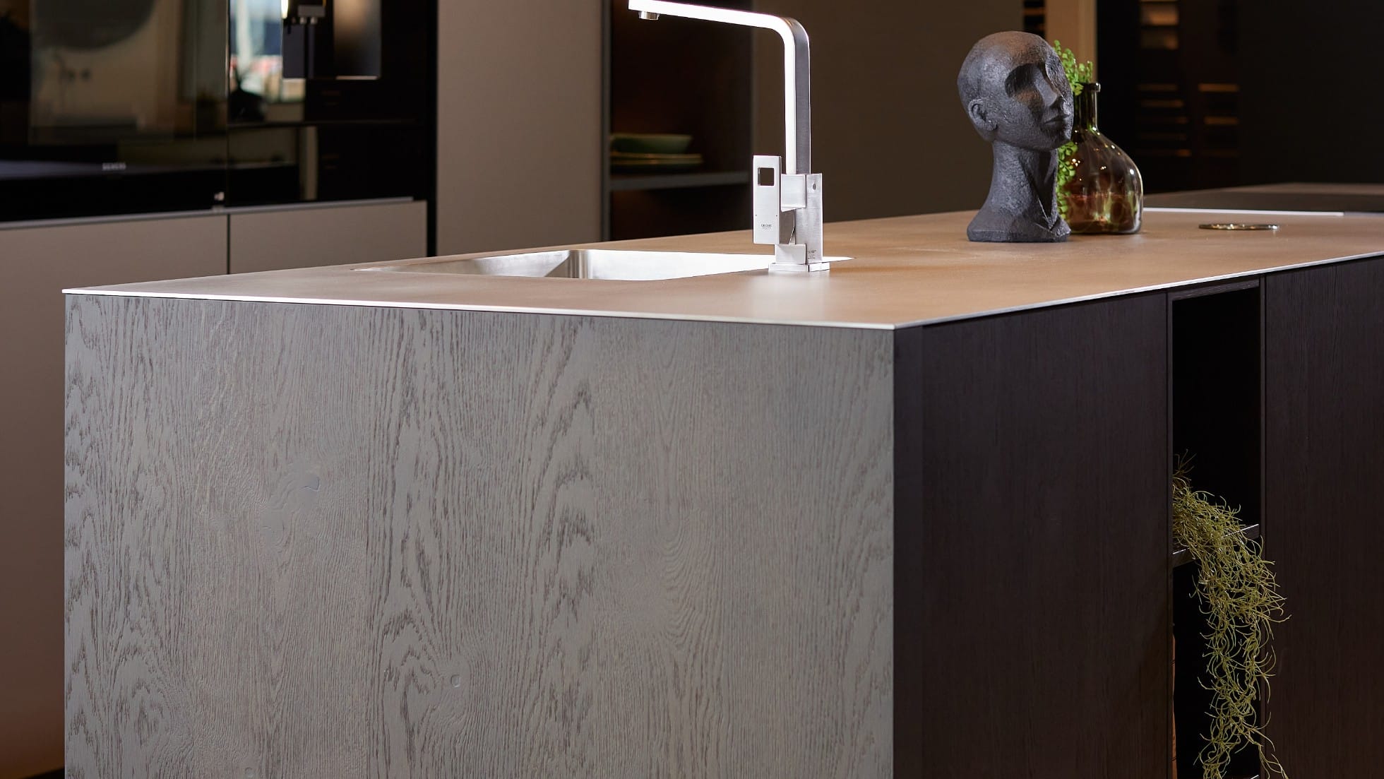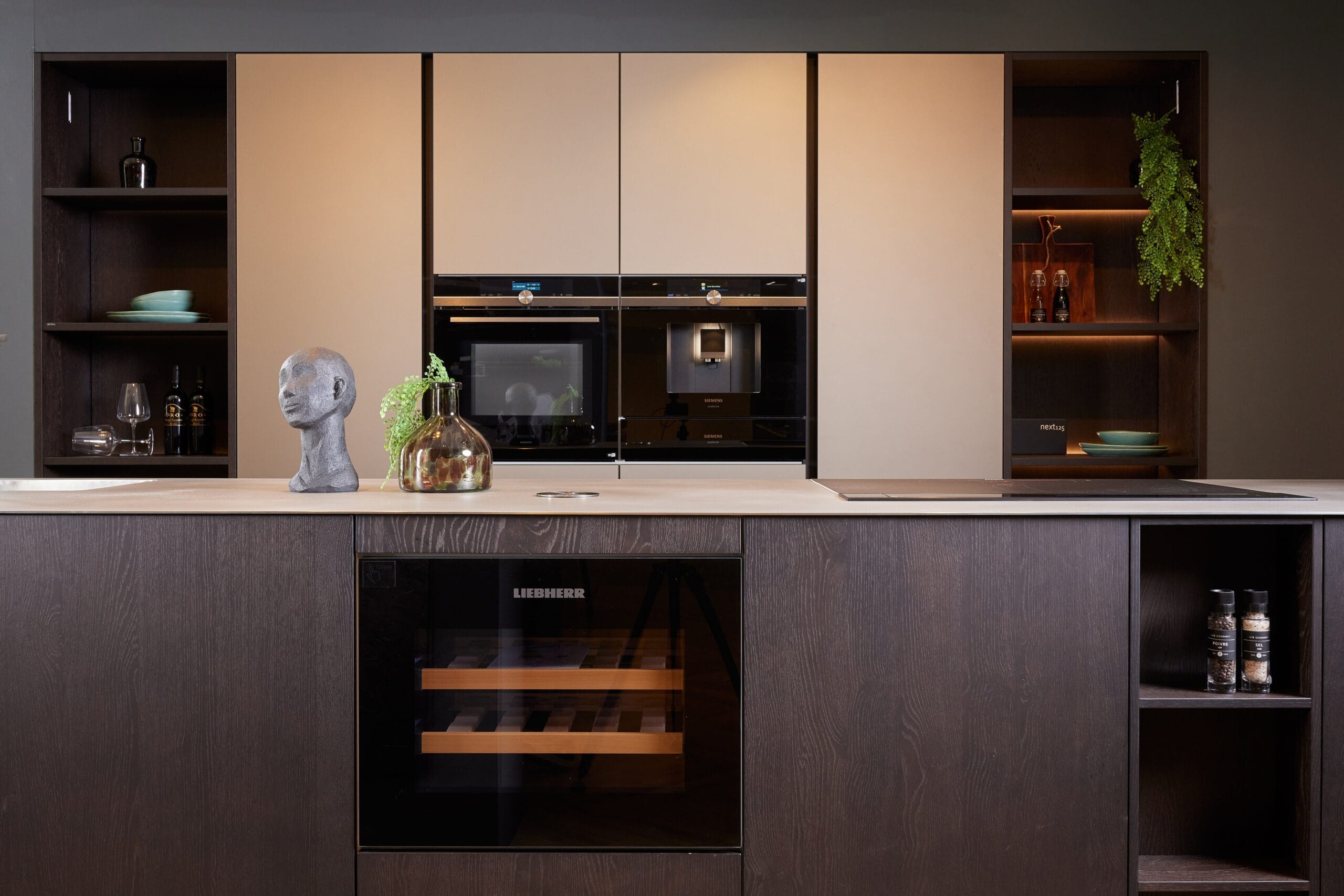 Deze Next125 keuken straalt kracht, luxe en balans uit. Het robuuste eiland in eiken tabak met een lavazwarte finish geeft de ruimte karakter, terwijl het massieve RVS werkblad met ‘warmgewalste’ uitstraling een industriële touch toevoegt. De wijnklimaatkast aan de zichtzijde is niet alleen functioneel, maar ook een echte eyecatcher. De strakke lijnen, greeploze fronten en de open nissen in warm hout zorgen voor contrast en harmonie. Een keuken waar design en gebruiksgemak elkaar moeiteloos versterken.